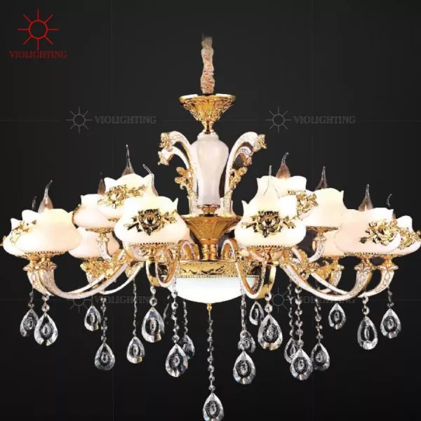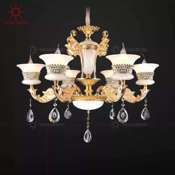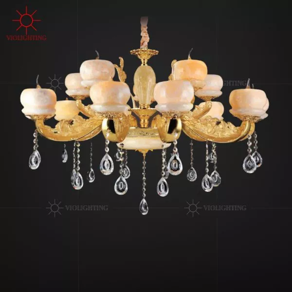 Ưu điểm của không gian phòng khách trong ngôi nhà Việt là có diện tích khá lớn, trần nhà thường được bố trí cao do đó việc lắp đặt 1 bộ đèn chùm sẽ giúp không gian trở nên hài hòa, ấn tượng hơn. Không chỉ cung cấp đầy đủ ánh sáng cho sinh hoạt cả gia đình, đèn chùm tay nến chao đá còn giúp tôn lên vẻ vẻ đẹp cổ điển, lịch lãm và sang trọng gây ấn tượng với khách đến chơi nhà. Ngoài chất liệu đồng và đá ngọc cao cấp, đèn chùm cổ điển nhà Violighting còn được thiết kế kết hợp đa dạng chất liệu như thủy tinh cao cấp, pha lê,…giúp không gian trở nên quý phái hơn, sang trọng hơn.