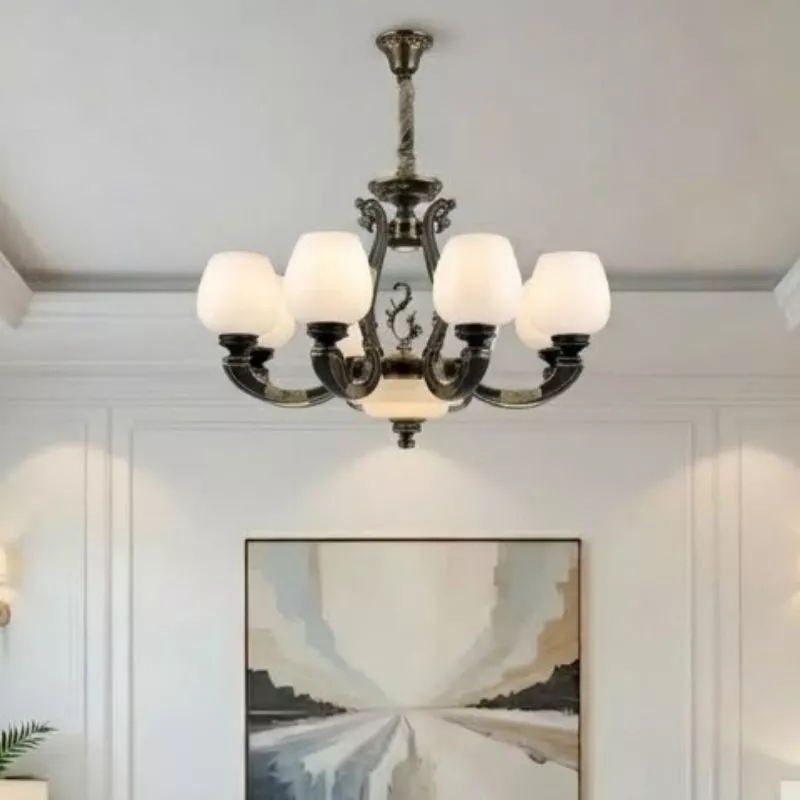 Đèn chùm tân cổ điển, chao thủy tinh 8 bóng cao cấp DC-1558
