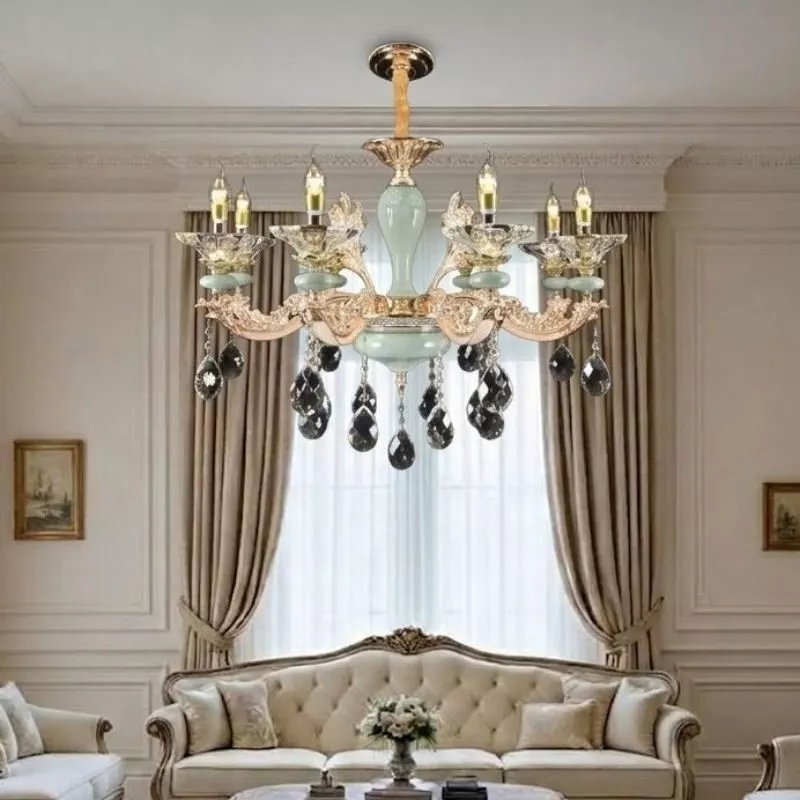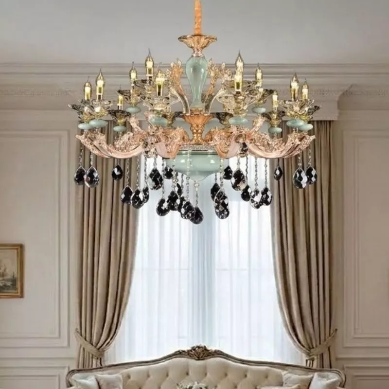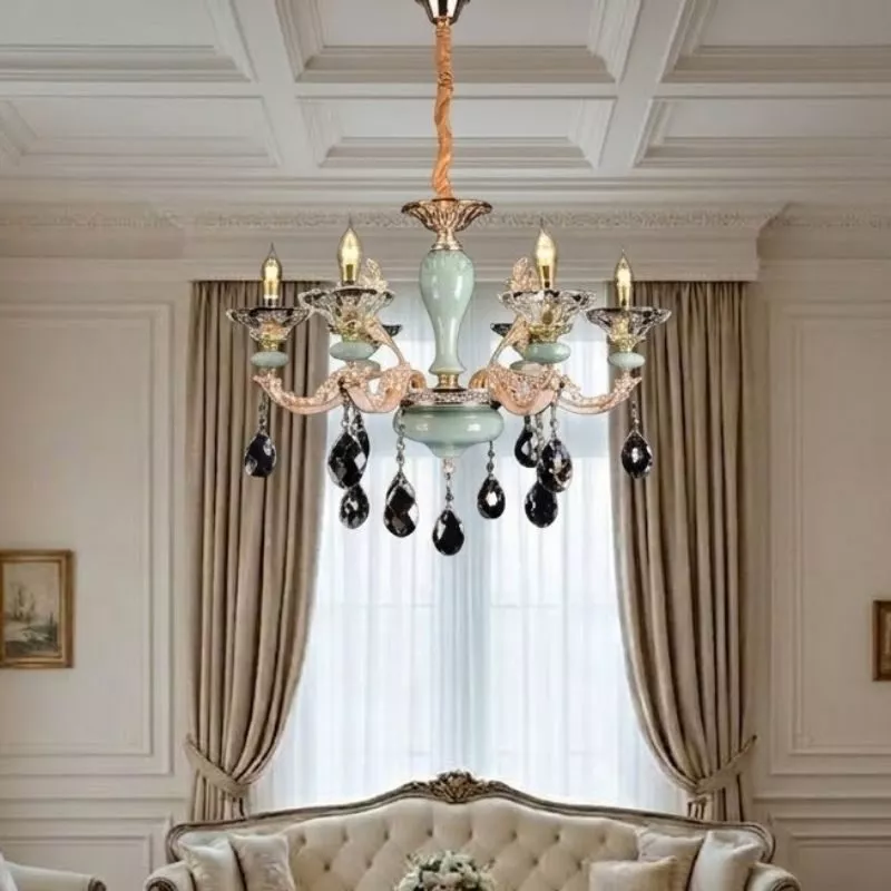 Đèn chùm tay nến, chao thủy tinh phối đá xanh ngọc DC-509, với thiết kế tinh xảo, được làm từ hợp kim si vàng đồng, kết hợp chao thủy tinh cao cấp, lựa chọn tuyệt với để trang trí, hoàn thiện không gian phòng khách, bàn ăn, nhà hàng, khách sạn, quán cafe, căn hộ, nhà phố và các công trình khác… Mẫu đèn chùm tay nến sử dụng bóng Led E14 chất lượng tốt, đem lại nguồn ánh sáng dễ chịu, an toàn cho mắt và tiện lợi cho việc thay thế sau này.